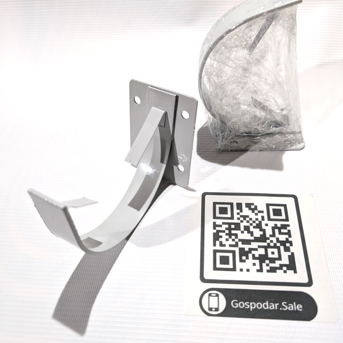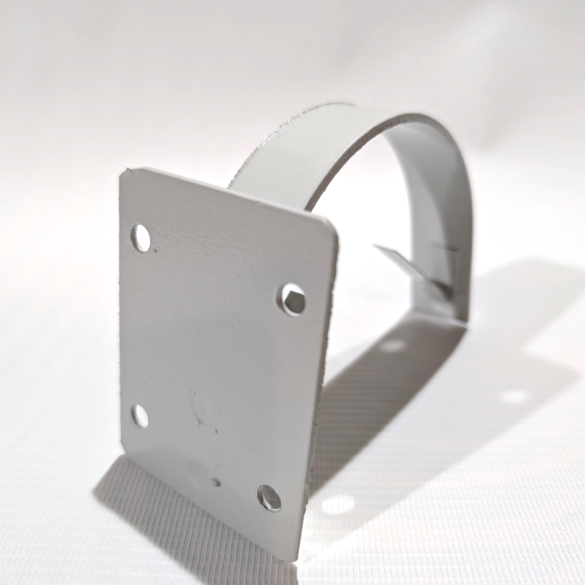 Коротке кріплення для жолоба Ø110 мм – це надійний металевий тримач, виготовлений із оцинкованої сталі та пофарбований у світло-сірий колір для захисту від корозії та естетичного вигляду.